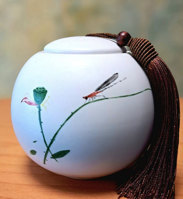 Dit geglazuurd keramisch bewaarpotje voor thee komt goed van pas, en staat mooi in elke kast of naast de theetafel. Het is 10 cm hoog en heeft een diameter van 11 cm. Het deksel sluit het potje hermetisch af, en is voorzien van een weelderige floshe waarmee je het bewaarpotje in het geheel kunt optillen.