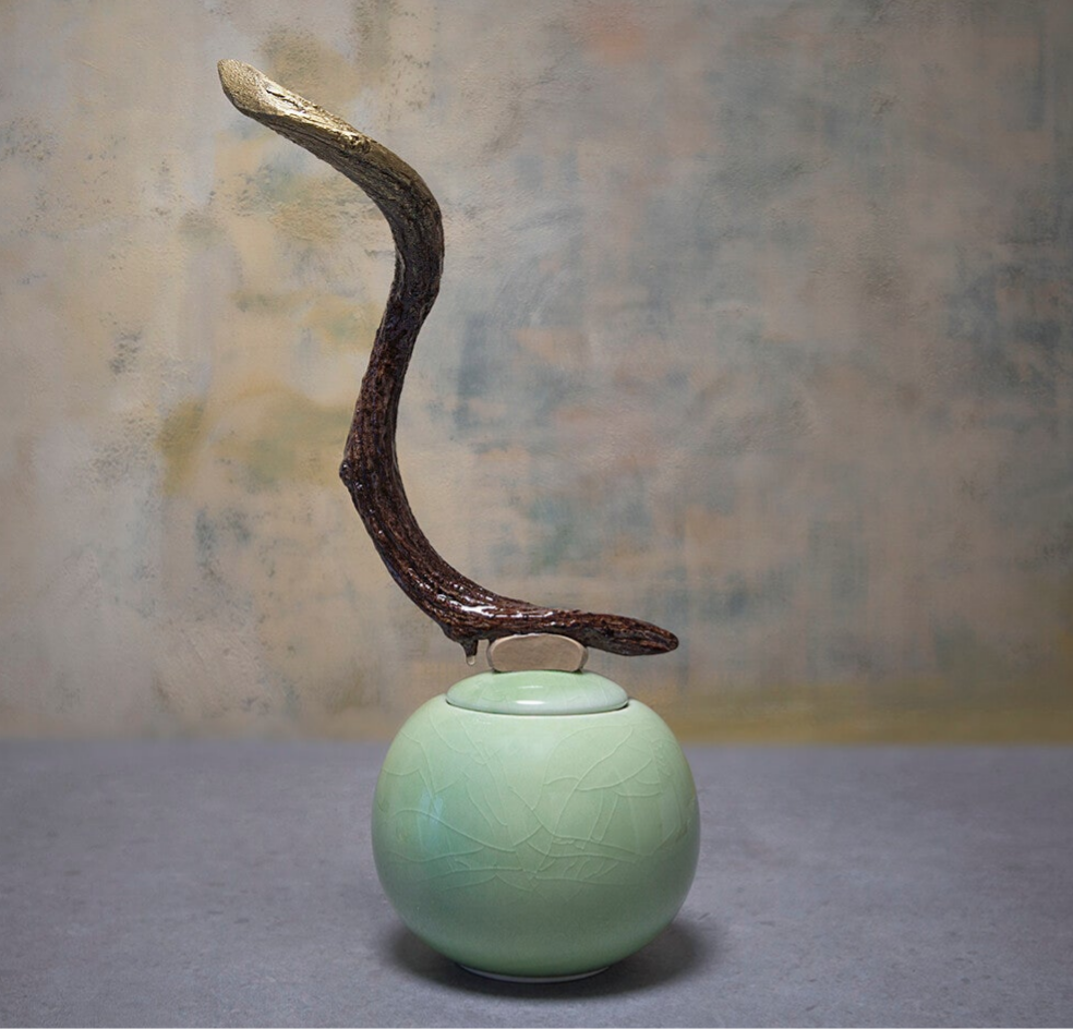 De combinatie van lichtgroen glazuur, gedroogde liaan en kunstig vormgegeven keramiek maakt deze bewaarpot niet alleen een praktisch instrument om de versheid van thee te behouden, maar ook een artistiek statement dat de connectie tussen mens en natuur op een intrigerende wijze weerspiegelt. Het is een ode aan de eeuwenoude kunst en filosofie van het theedrinken, verpakt in een hedendaags, esthetisch meesterwerk.