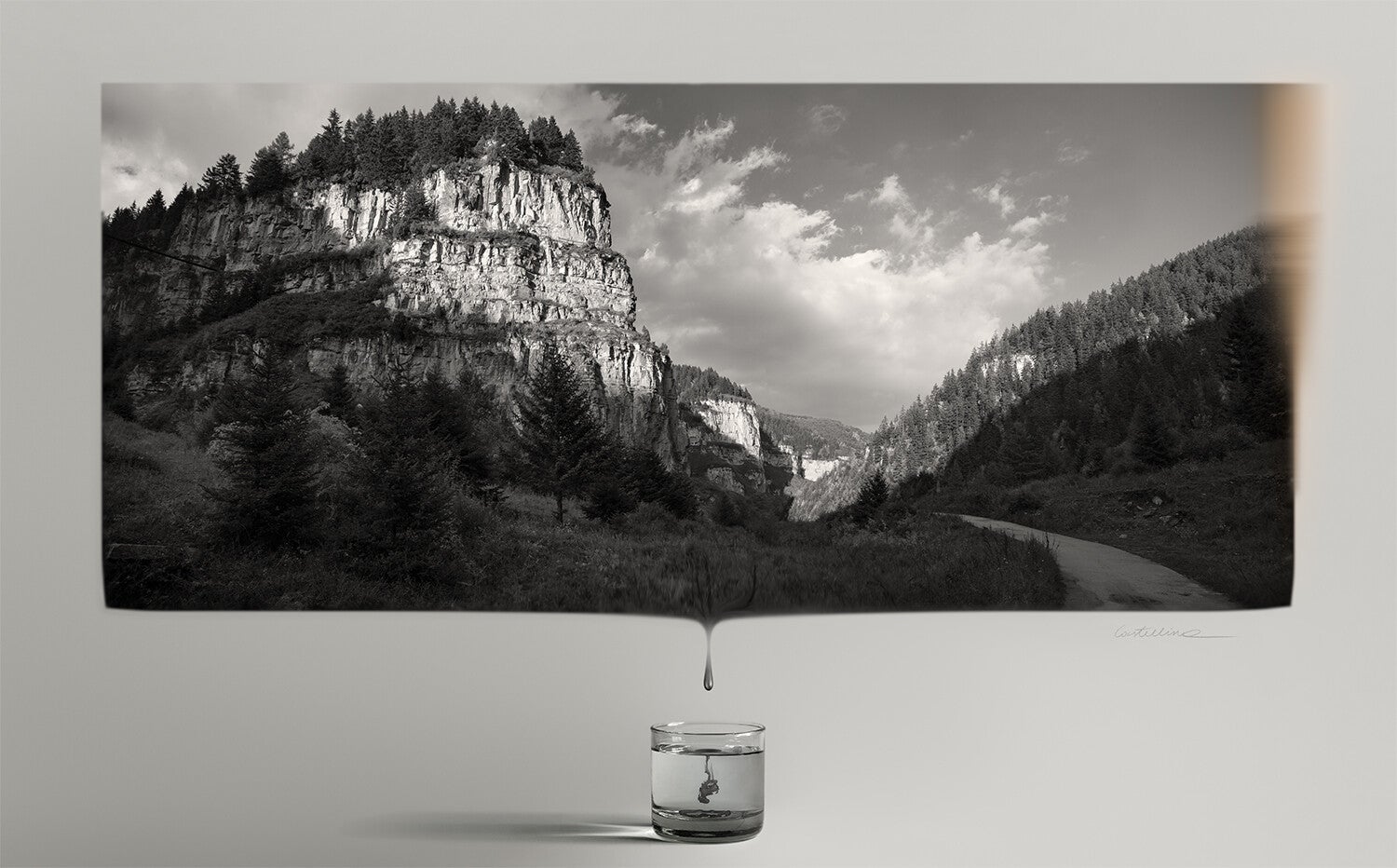 Het druppelen in de kopjes symboliseert de vergankelijkheid van ons bestaan en alles wat we kennen. Elke neervallende druppel roept het geleidelijk wegvloeien van de tijd en alle emoties op die we koesteren. De grootsheid van majestueuze en diepzinnige landschappen lijkt uiteindelijk niets meer dan een samenstelling van kwantum-fysische materie op de golven van een elektromagnetisch veld in de oneindigheid van een duizelingwekkend, donker vacuüm. Daar, waar de singulariteit van een onmetelijke natuurlijke intelligentie bestaat, vervagen de grootsheid en betekenis van alles tot een subtiel samenspel van elementaire krachten in een constant repetitief schouwtoneel. Het samenspel van zeer hoge kwaliteit fotografie en de filosofische benadering van Davy, resulteert in een collectie die de toeschouwer uitnodigt om het fysiek bekende te overstijgen en de diepten van het onbekende te verkennen.
