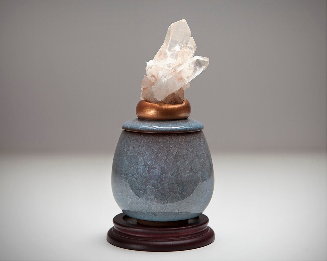 Vervaardigd uit keramiek en voorzien van een glazuur, aangebracht op een manier die alleen meesterkeramisten uit China kunnen realiseren. Op het perfect passende dekseltje pronkt een bijpassende bergkristal, die zorgvuldig is aangebracht op een inzetstuk dat met een koperen vijs aan het dekseltje is bevestigd.