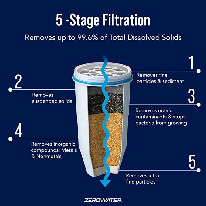 Het ZeroWater filter combineert wel vijf verschillende waterfilter technologieën die samen bijna alle vervuiling uit jouw drinkwater kunnen halen. Deze filters zijn speciaal gemaakt voor de ZeroWater waterkannen.