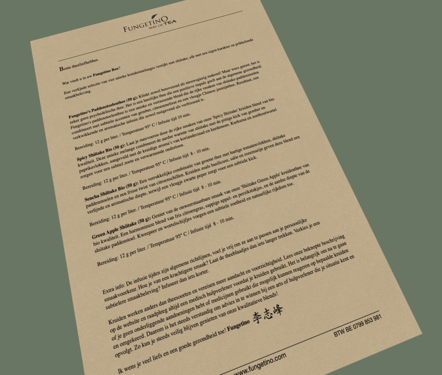 In de box vind je een stijlvol briefhoofd met uitleg over de ingrediënten en zet instructies, zodat elke kop een bijzondere ervaring wordt. Laat je verrassen door de diepe, aardse tonen en de bijzondere harmonie van kruiden en de shiitake paddenstoel. Een uniek cadeau voor theeliefhebbers en wellness-ontdekkers!