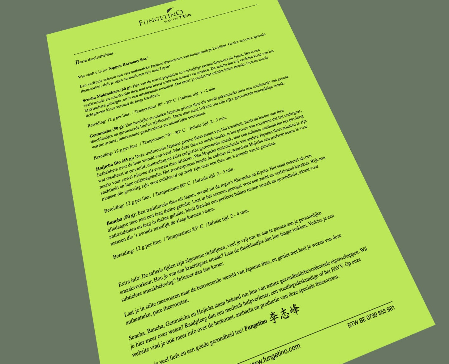 In de box vind je een briefhoofd met gedetailleerde uitleg over de blends en zet instructies, zodat je elke thee perfect kunt bereiden. De ideale keuze voor de liefhebber van authentieke Japanse theebeleving! Geniet, sluit je ogen en onderneem een boeiende reis naar het verre Japan!