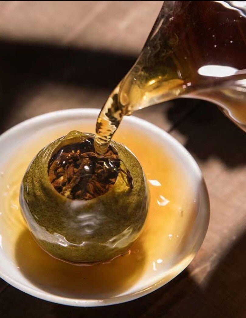 Xiao Qing Gan is een unieke combinatie van rijpe Pu Erh-thee en een gedroogd mini-groene mandarijntje uit Xinhui, China. De holle citrusvrucht is gevuld met pu-erhthee, wat zorgt voor een verrassende balans tussen de aardse diepte van Pu Erh thee en de frisse, fruitige tonen van citrus.